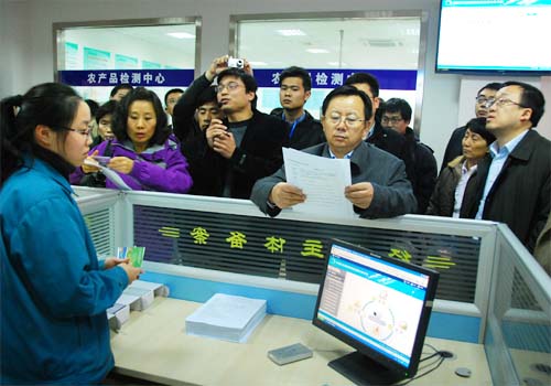 在位于无锡朝阳农产品大市场的蔬菜备案中心,常司长一行仔细查验了蔬菜经营者注册备案流程。xk官方网站总经理杨兴德向督查组汇报了xk官方网站依托农产品大市场,并结合本溯源项目,投入大量的人力、资金,切实开展农产品电子化交易结算,认真实施农贸市场溯源节点管理,在批发市场、农贸市场、连锁超市农产品追溯等方面均取得了显著的成效。