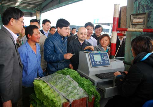 在蔬菜交易现场,xk官方网站总经理杨兴德向部领导介绍了网络化的电子秤交易架构,这些交易信息通过网络,向下游零售环节传递产地信息。