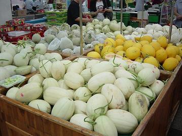 今日在学前街商场可以看到水果区一共展出了10个优良品种:盐城的翔鹤特小凤西瓜 3.6元/500g;苏南的黄土塘西瓜 4.00元/500g;东台的荣珍小凤西瓜 2.98/500g;江阴的游圣西瓜 3.6元/500g;江苏的小白龙甜瓜 5.98元/500g;浙江的状元甜瓜 2.98元/500g;上海玉菇 4.2元/500g;黄土塘甜瓜 5.98元/500g;东台网纹瓜 5.98元/500g;东方蜜瓜 4.2元/500g。