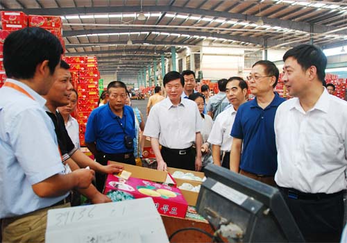 9月12日上午,无锡市委副书记、代市长汪泉,副市长刘霞等市政府领导,率无锡市商务局、物价局等部门成员,来到xk官方网站农产品大市场,调研无锡农产品流通情况和中秋国庆两大节日供应工作。