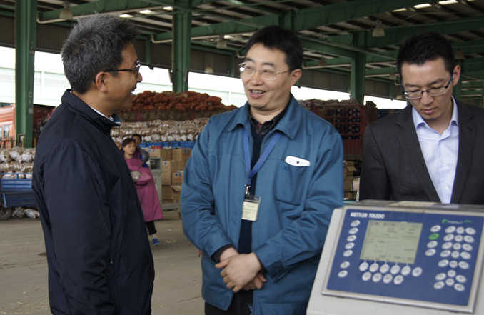 总经理朱健祥向客人详细介绍了朝阳农产品大市场的整体规划建设,并陪同客人参观信息中心、检测中心、结算中心,向他们介绍了农产品检测、信息登记备案等相关情况。随后陪同客人深入经营区,调研电子交易过程和经营情况。