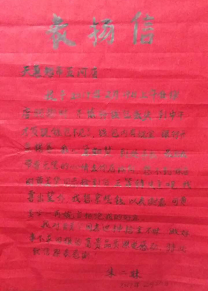 我于2017年2月19日上午在你店购物时,不慎将钱包丢失,到中午才发现钱包不见了,钱包内有现金(数千元)、银行卡、票据等。我心急如焚,到处寻找,最后我带着无望的心情去你店询问,想不到你店的黄美华同志捡到钱包后正等待失主呢。我喜出望外,想拿些钱以表谢意,可黄美华一再婉言谢绝我的好意。