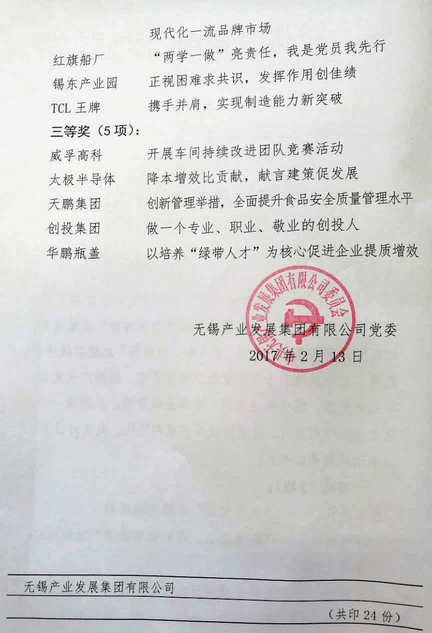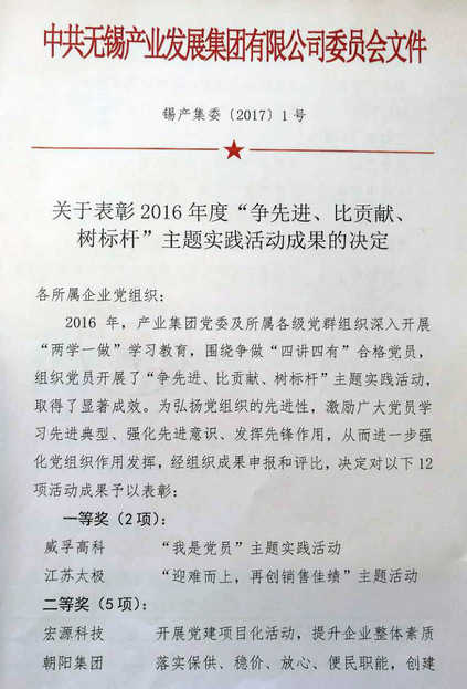 根据锡产集委【2017】1号文件精神,2016年,产业集团党委及所属各党群组织开展了“争先进、比贡献、树标杆”主题实践活动。朝阳集团党委组织开展了“落实保供、稳价、放心、便民职能,创建现代化一流品牌市场”活动,经产业集团党委评比,荣获二等奖,并予以表彰。