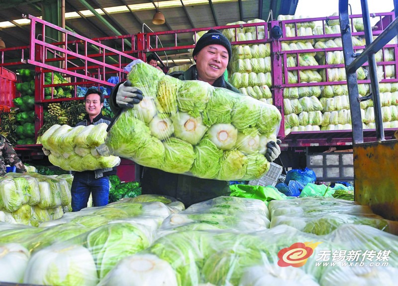 昨天,朝阳蔬菜批发市场员工将储备菜搬运入库。持续低温且春节临近,该批发市场积极履行企业社会责任,每天储备1000吨左右的白菜、萝卜等相关蔬菜,以弥补因低温而导致的地产蔬菜供应缺口,让市民安心过节。