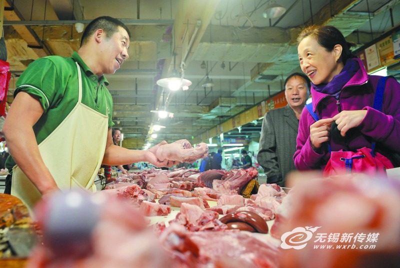 11月6日,市民在朝阳农贸市场购买猪肉。受供货充足等多方面原因影响,近期我市猪肉价格“跌跌不休”,白条肉批发价从国庆节的每斤8.2元左右降到现在的7.1元-7.2元。“草排、大排、去皮腿心、腿心肉糜价格也相应下降。”市场相关人士介绍。此次全线降价后的猪肉价格跟10年前基本持平,降价后销量猛增,比平日翻番。 (张立伟 摄)