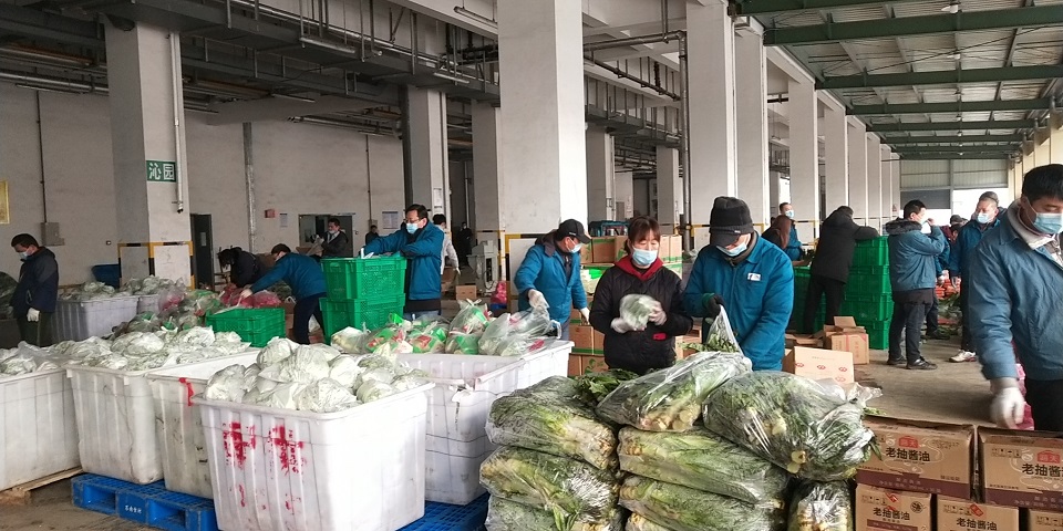 各种生鲜及生活物资被分配到朝阳冷库月台各个点后,除门岗防疫人员外,北区干部职工全员参加打包配送。从开始的750份的打包,到现在的2950份;从北区员工到朝阳集团各单位一齐干。