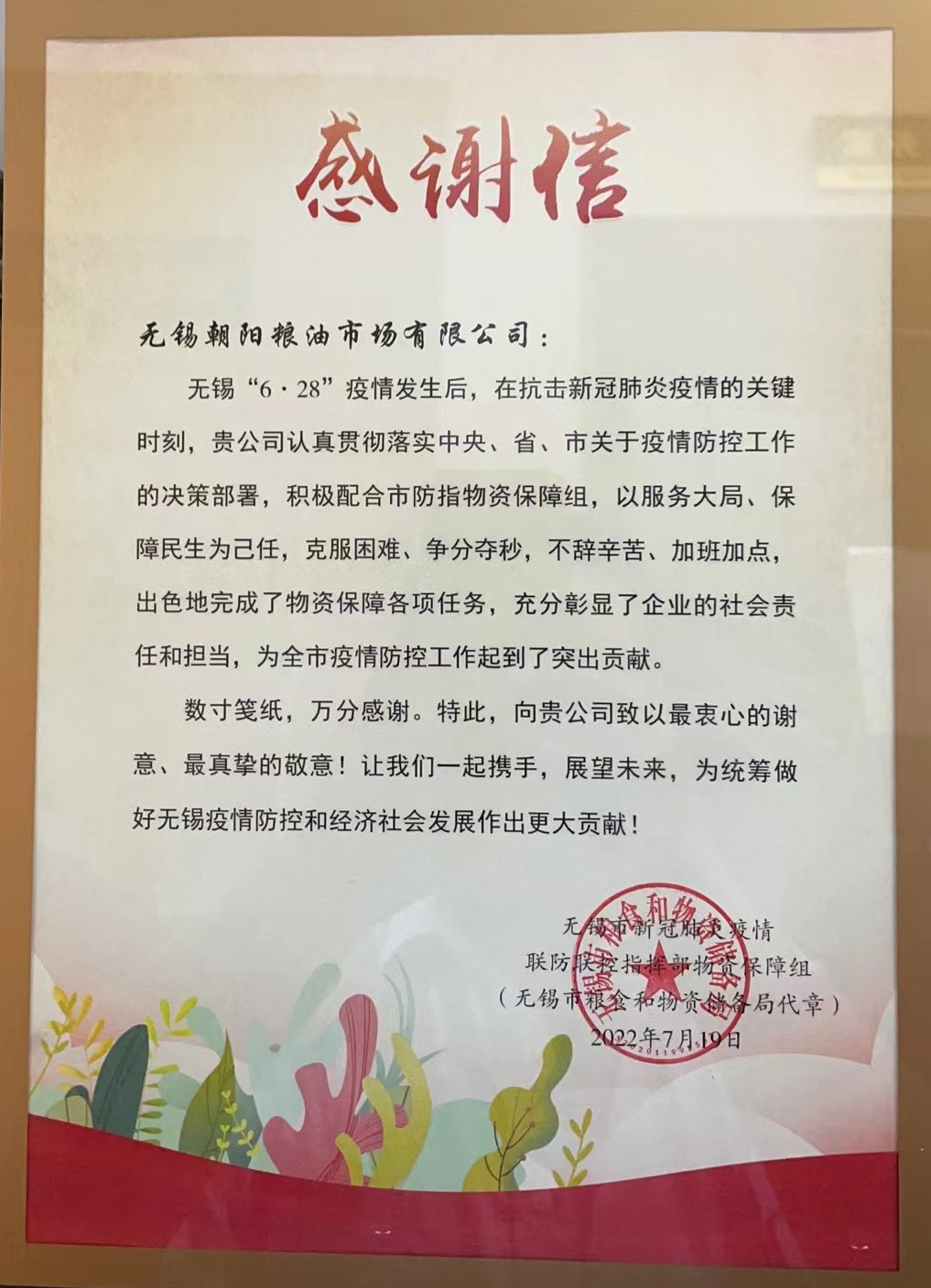 7月28日上午,无锡市粮食和物资储备局物资储备处陈界和副处长代表无锡市新冠疫情联防联控指挥部物资保障处给粮油市场送来了感谢信,感谢粮油市场在无锡“6.28”疫情发生以来克服困难、争分夺秒、不辞辛劳、加班加点、以保障民生为己任,出色完成了物资保障各项任务,充分彰显了企业的社会责任和担当,为全市疫情防控工作起到了突出贡献。(