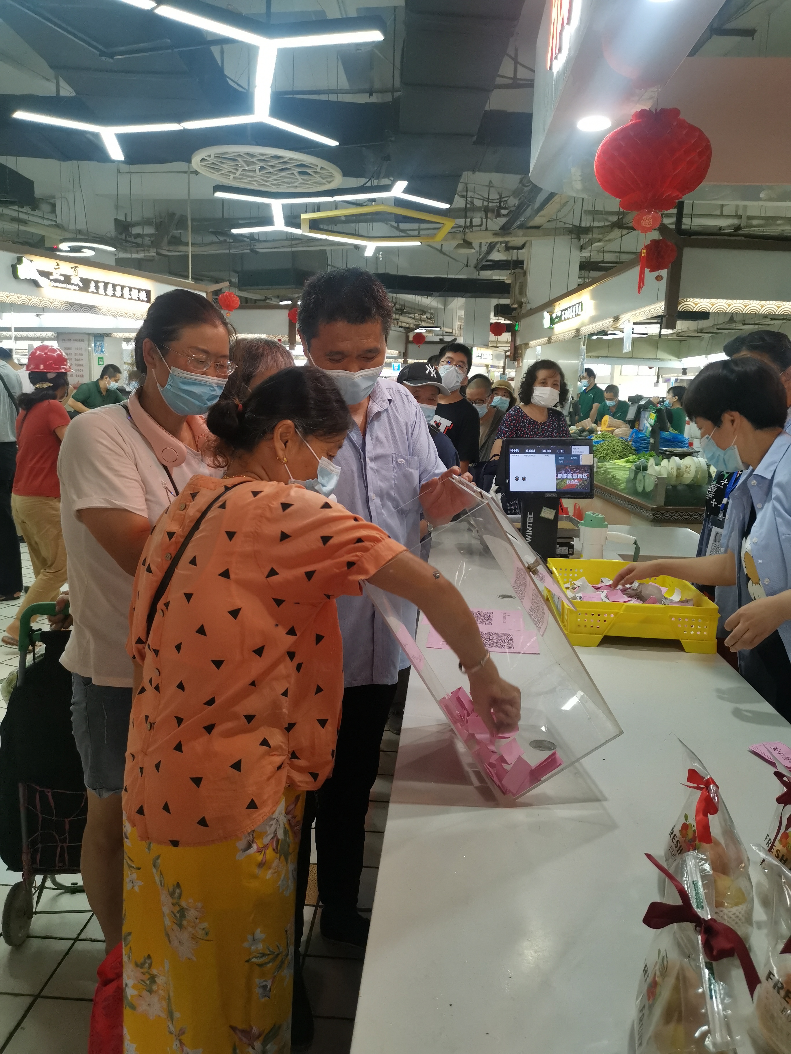 酷暑难耐,马大嫂们出门买菜都要鼓起很大勇气。朝阳农贸市场营业时间全场开放中央空调,让一路奔波的消费者们感受到夏日的清凉,可以在场内定定心心买到新鲜菜、放心菜、平价菜。每天12个品种的惠民平价菜以及多款限时特惠活动,吸引了众多消费者冒着酷暑前来抢购。近期,朝阳农贸市场又开展了收银小票抽奖活动。消费者只要凭当天的购物小票,就可以到一楼服务台参与现场抽奖,奖额有限,抽完为止。本次活动的奖品是新鲜采摘的水蜜桃20份。上午9点开始,不少顾客都已经在服务台前有序排队,凭着收银小票进行抽奖。抽到奖的顾客喜笑颜开,把一份甜蜜带回家。没有抽到奖的顾客也开怀一笑,体验到买菜的乐趣。据悉,抽奖活动还将不定期开展,鸡蛋、阿三百叶等民生热销商品都将作为奖品,给买菜的顾客们送去一份惊喜。