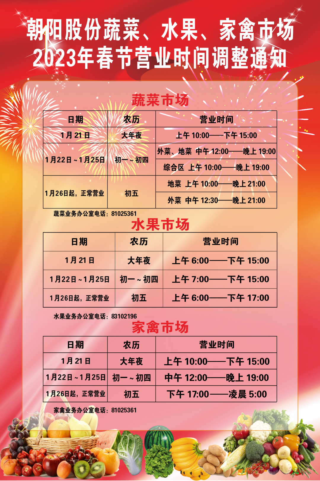 朝阳股份蔬菜、水果、家禽市场2023年春节营业时间调整通知