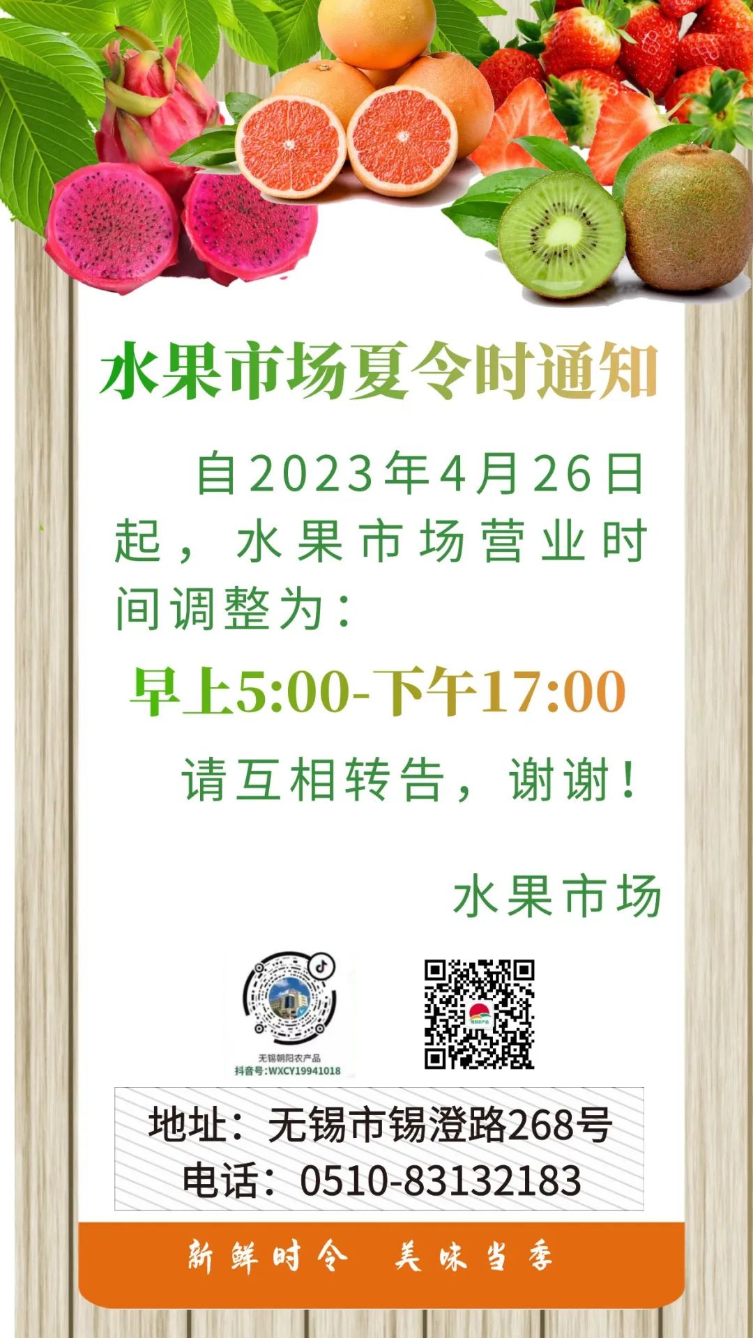 自4月26日起,朝阳股份水果市场营业时间作季节性调整,由原来的早上6:00~下午17:00调整为: