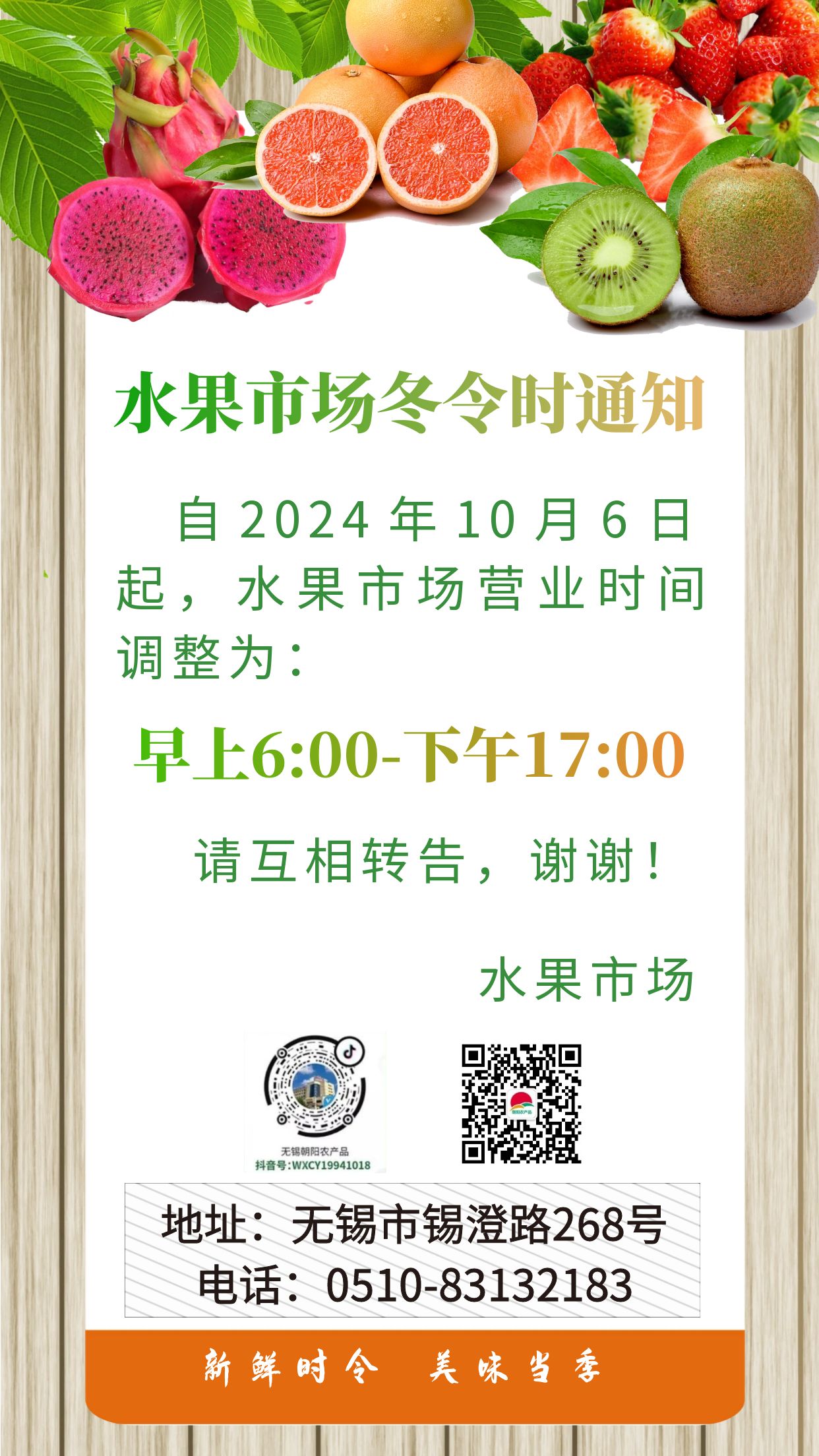 朝阳股份水果市场冬令时营业时间通知