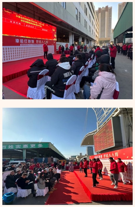 本次活动特别邀请了蔬菜、水果两大市场2024年第四季度进货额排名前200名的会员参与抽奖盛宴。现场人头攒动,会员、客商与员工欢聚一堂,共同期待着大奖的揭晓。麒麟新锐营青年员工更是带来了精彩的劲歌热舞,为活动增添了无限的活力与热情。