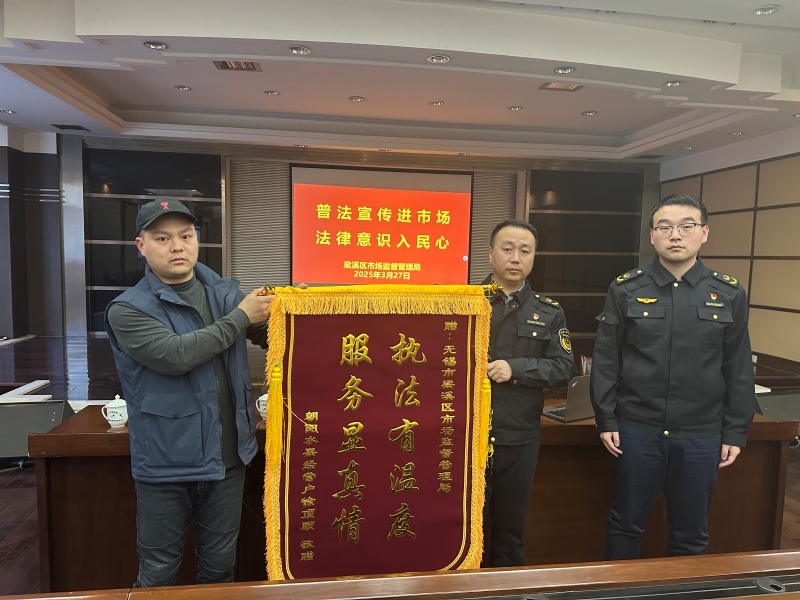 为感谢一直以来梁溪区市场监督管理局对市场及广大经营户的支持关心,客商代表特制锦旗赠予区局,向区局全体工作人员表示最诚挚的敬意,也祝愿区局各项工作顺利,再创佳绩! (供稿:张柯宇) |