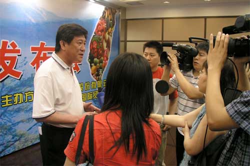 新闻发布会在无锡朝阳股份有限公司所属的锡澄果菜交易市场举行,巨大的背景版似乎让人们感受到阿里山松籁与太湖涛声的呼应。