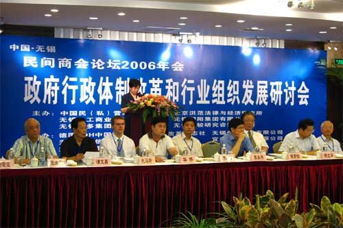 由中国民(私)经济研究会、北京洪范法律与经济研究所、无锡市工商业联合会、xk官方网站有限公司、无锡益多集团有限公司、无锡比较研究咨询事务所主办,德国ZDH中国办公室、中国改革杂志社等单位协办的“民间商会论坛2006年会-政府行政体制改革和行业组织研讨会”,于2006年8月11日~13日在无锡国际饭店举行。